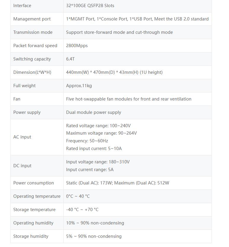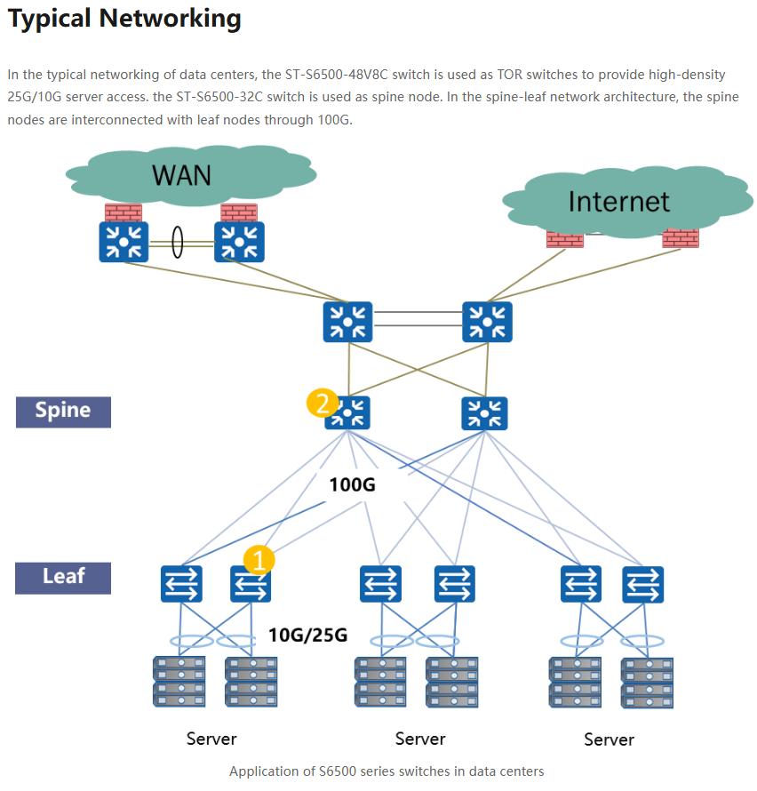 The WT-S6500-32C switch is a new generation of high-performance, high-density data center Ethernet switch products developed by Sintai for cloud data centers and cloud computing networks. Supports 32*100G slots, 1+1 hot-swappable redundant power, 4+1 hot-swappable redundant fans with intelligent adjustable speed, spine-leaf network architecture design requirements.